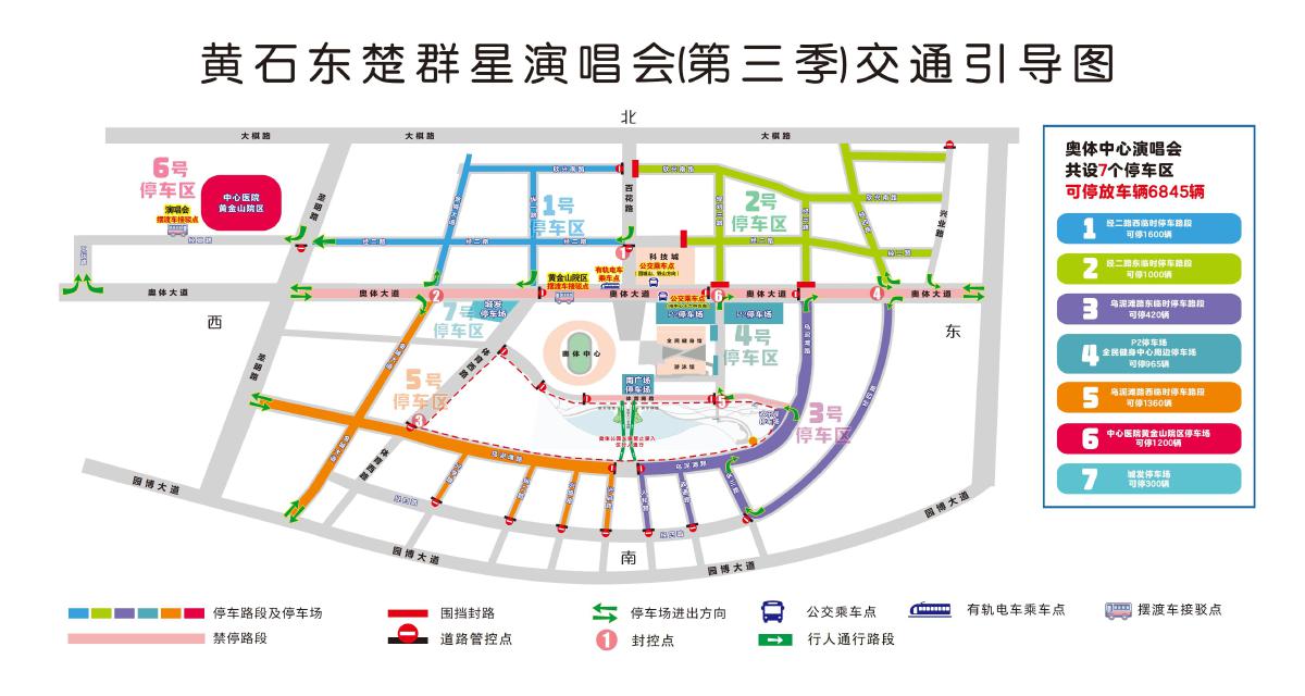 交警部門介紹,演唱會期間,現場周邊共設有7個停車區,可停放車輛6845輛,具體為: